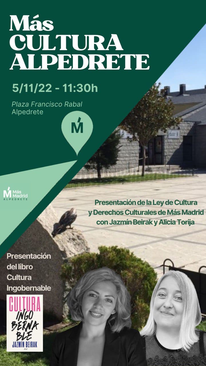 Mañana, sábado 5 de noviembre, a partir de las 11.30 horas, la plaza Francisco Rabal de Alpedrete acogerá un acto organizado por Más Madrid al que acudirán las diputadas regionales de esta formación Jazmín Beirak y Alicia Torija, quienes presentarán la Ley de Cultura y Derechos Culturales de la Comunidad de Madrid recientemente presentada por Más Madrid en la Asamblea regional. Además se dará a conocer el libro «Cultura ingobernable», de Jazmín Beirak, y se debatirá sobre la situación cultural en Alpedrete. Habrá alguna actuación artística para amenizar el evento.