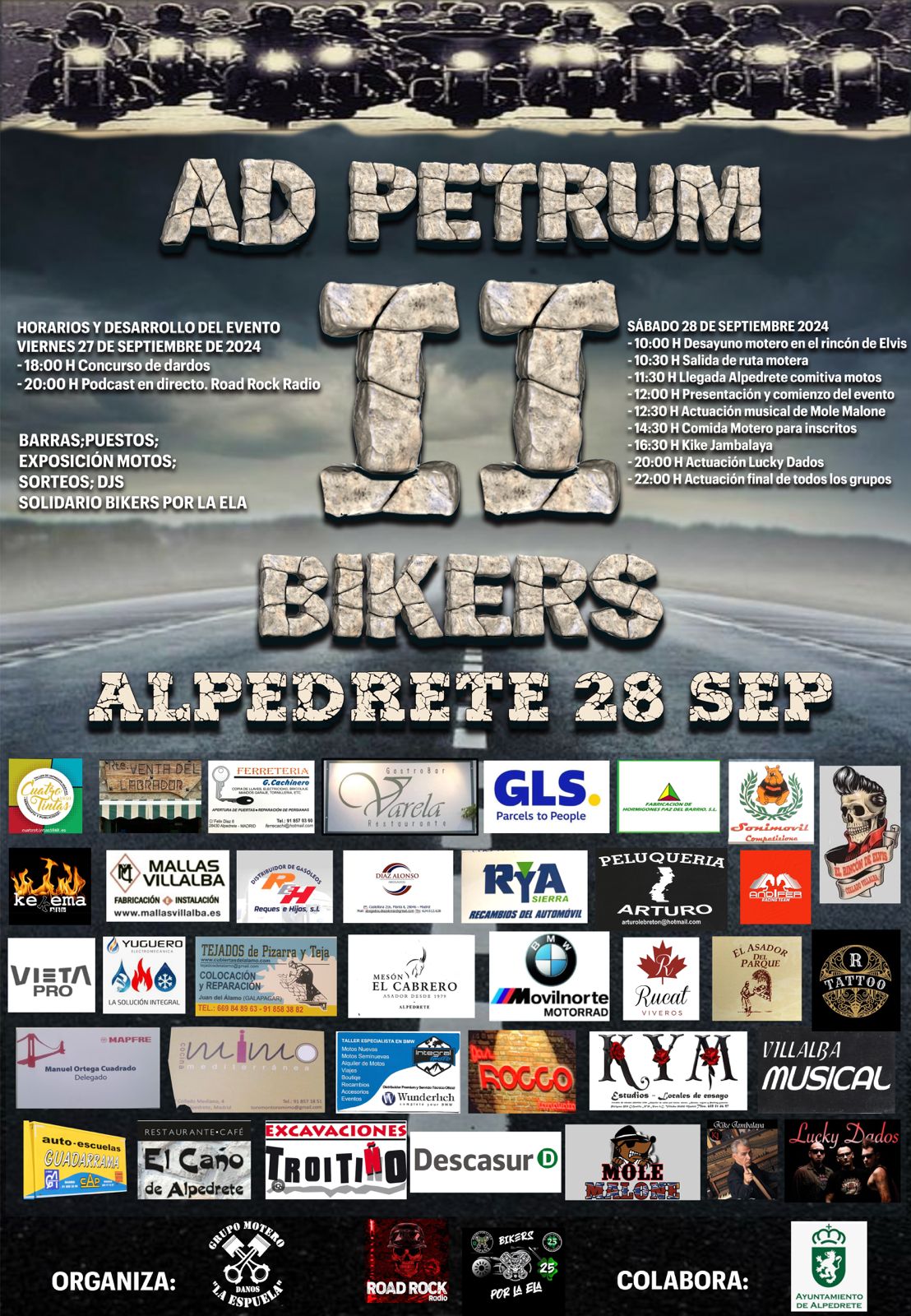Los días 27 y 28 de septiembre Alpedrete celebra la II Edición de la concentración “Ad Petrum Bikers”, un evento organizado por el grupo motero “Danos la Espuela” con la colaboración del Ayuntamiento que dará la oportunidad de disfrutar de dos jornadas para los amantes de las motos y el público en general.