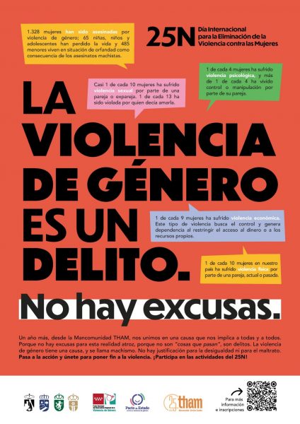 Durante el mes de noviembre, el Ayuntamiento de Alpedrete junto a la Mancomunidad THAM organiza una amplia programación de actividades para conmemorar el Día Internacional para la Eliminación de la Violencia Contra las Mujeres. La concejal de Servicios Sociales, Aurora Gil, ha asegurado que “esta serie de eventos demuestran el compromiso del Ayuntamiento con la igualdad y las mujeres. Es una programación pensada para concienciar a los vecinos de nuestra localidad y aportar nuestro granito de arena en esta causa”.