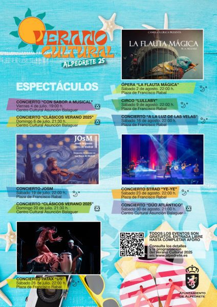 El Ayuntamiento de Alpedrete invita a todos los vecinos y visitantes de la localidad a despedir el verano por todo lo alto con dos nuevas citas culturales. El Verano Cultural ha vuelto a desarrollarse este año asentándose como la principal alternativa de ocio para el disfrute de todos los públicos. En total han sido casi una veintena las actividades programadas, entre conciertos de música clásica, ópera o el ritmo de la propuesta de Strad, entre otras, y proyecciones audiovisuales y demostraciones circenses. Las citas culturales comenzaron el 4 de julio y desde entonces han tenido una gran acogida del público que ha llenado la plaza de Francisco Rabal, el auditorio municipal o el Parque de los Negrales durante la celebración de las Fiestas del Carmen.