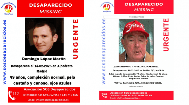 Además, desde este mismo organismo se ha alertado de la desaparición de Juan Antonio C. M., de 72 años, desaparecido el 10 de febrero en Zarzalejo. Según la Guardia Civil, el hombre mide 1,70 metros, pesa 75 kg, tiene pelo canoso y corto, y ojos marrones. En el momento de su desaparición, vestía una chaqueta verde y pantalón vaquero azul. Las autoridades han destacado que necesita medicación, lo que aumenta la urgencia de su localización.