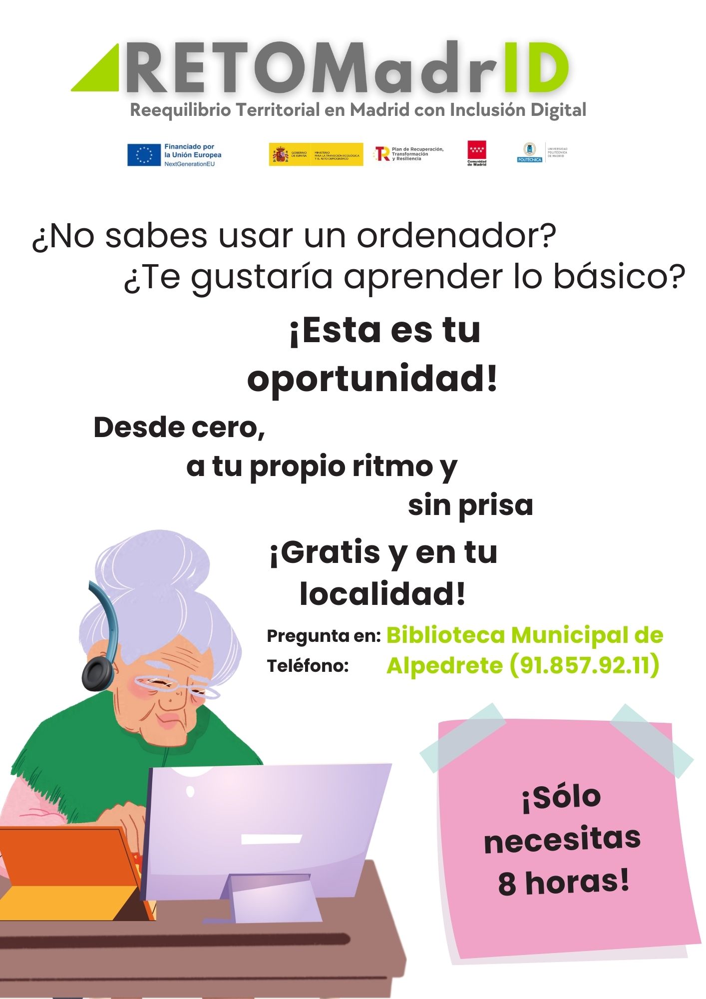 La Biblioteca Municipal de Alpedrete participa en el proyecto “Reto MadrID”, un proyecto de la Comunidad de Madrid junto a la Universidad Politécnica de Madrid, dentro del Plan de Recuperación, Transformación y Resiliencia financiado por la Unión Europea, Next Generation EU, destinado a disminuir la brecha digital en áreas rurales de la región. Un proyecto formativo con el objetivo de promover la alfabetización digital en los municipios madrileños.