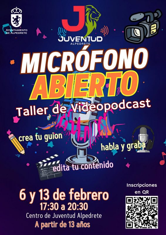 El Centro de Juventud de Alpedrete organiza “Micrófono abierto”, un taller práctico para aprender a crear un podcast y un videopodcast del guion a la grabación y la edición. A lo largo de dos sesiones, los participantes conocerán las claves para desarrollar una idea y convertirla en un contenido propio, trabajando de forma práctica los primeros pasos de la comunicación audiovisual. La actividad está dirigida a jóvenes a partir de 13 años.