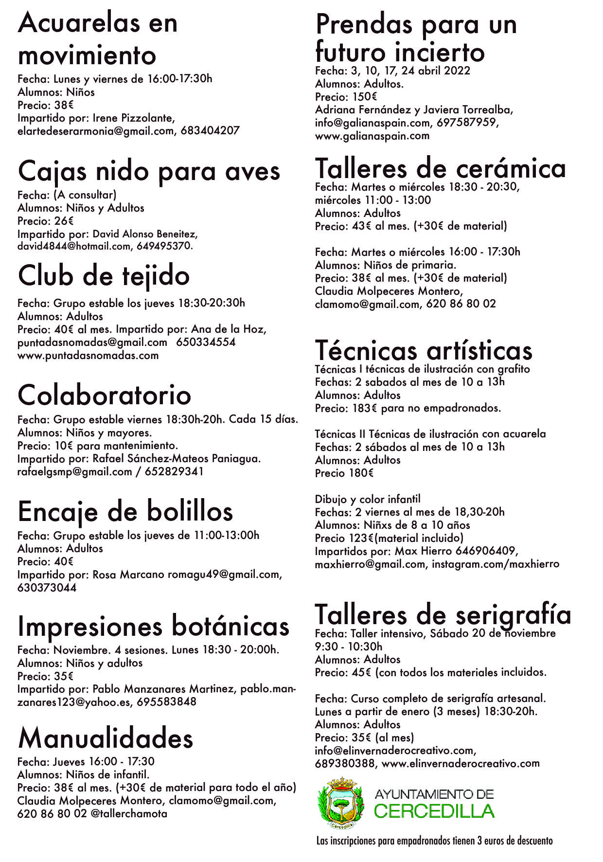 Ya se han abierto las inscripciones para los talleres de Arte y Artesanía en la Asociación de Artesanos y Artistas de Cercedilla para el próximo curso 2021-22. Entre la oferta, los interesados podrán acudir a Acuarelas en movimiento, Cajas nido para aves, Club de tejido, Colaboratorio, Encaje de bolillos, Impresiones botánicas, Manualidades, Prendas para un futuro incierto, Talleres de cerámica, Técnicas artísticas o Talleres de serigrafía.