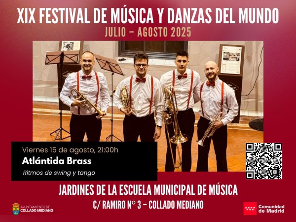 El XIX Festival de Música y Danzas del Mundo continúa su recorrido por las músicas del planeta con una nueva propuesta llena de estilo y energía en Collado Mediano. El viernes 15 de agosto, a las 21:00 horas, será el turno de Atlántida Brass, una formación instrumental que combina el swing más vibrante con el magnetismo del tango y otros ritmos populares del siglo XX.