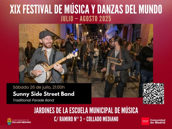 El próximo sábado 26 de julio, la formación Sunny Side Street Band llegará a los Jardines de la Escuela Municipal de Música para ofrecer un concierto lleno de ritmo, color y espíritu festivo, dentro del XIX Festival de Música y Danzas del Mundo de Collado Mediano. La actuación comenzará a las 21:00 h., en la calle Ramiro, 3, con entradas a precios populares.