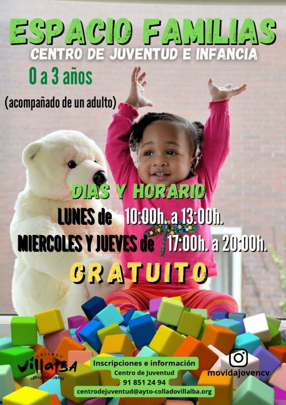 La Concejalía de Infancia y Juventud del Ayuntamiento de Collado Villalba pone en marcha un nuevo ‘Espacio para familias’, dirigido a niños de 0 a 3 años, acompañados de un adulto, que podrán disfrutar de un aula preparada los lunes de 10:00 a 13:00 h. y miércoles y jueves de 17:00 a 20:00 h. Este espacio está abierto a todas las familias que busquen lugar seguro y adecuado para sus hijos con edades entre 0 a 3 años. No es necesario inscribirse previamente, aunque el aforo es limitado.