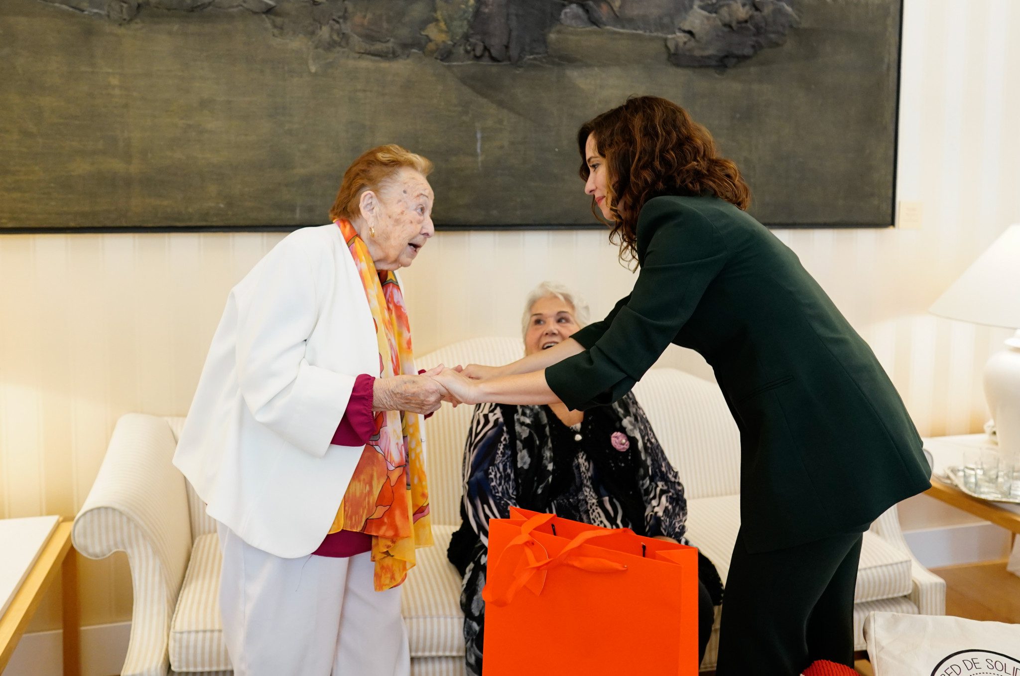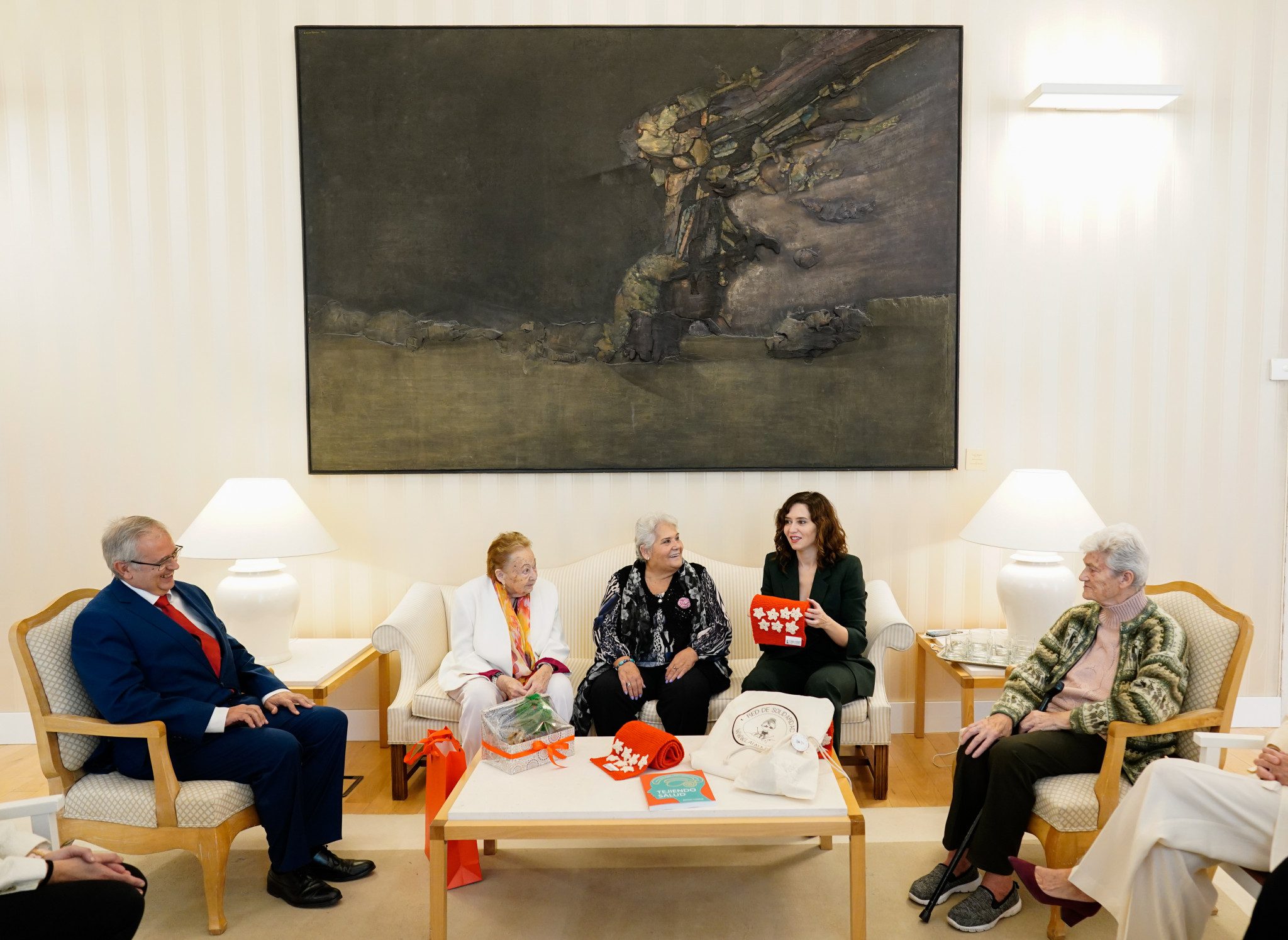 La presidenta de la Comunidad de Madrid, Isabel Díaz Ayuso, ha mantenido hoy un encuentro en la Real Casa de Correos con un grupo de usuarios de la Residencia de Mayores Amavir Nuestra Casa, de Collado Villalba que participan en el proyecto «Tejiendo Solidaridad».