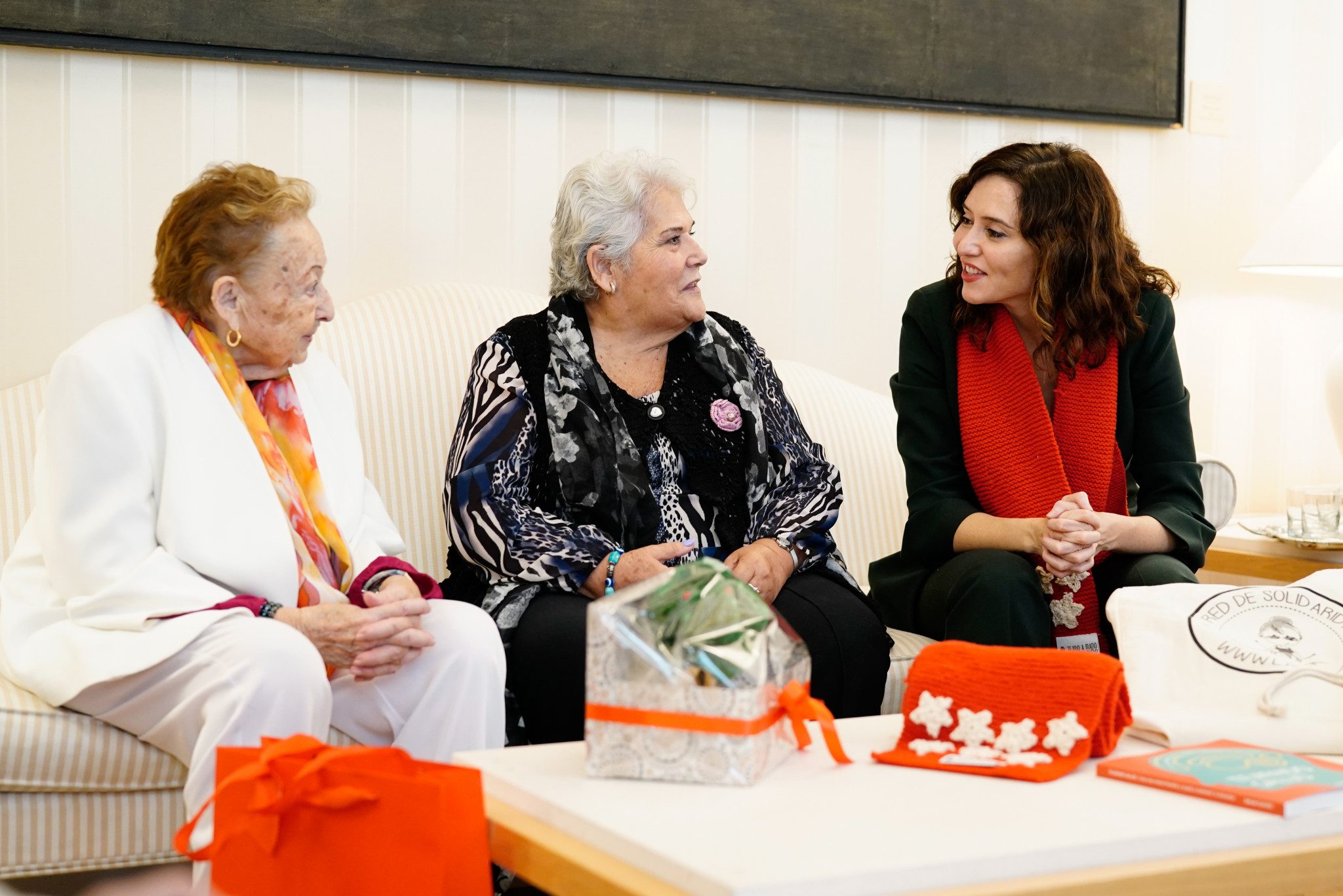 Díaz Ayuso ha charlado con Manuela, Rosa, Dolores y Marina, que le han contado sus experiencias en el centro y en este taller y le han obsequiado con una bufanda con los colores de la bandera de la Comunidad de Madrid.