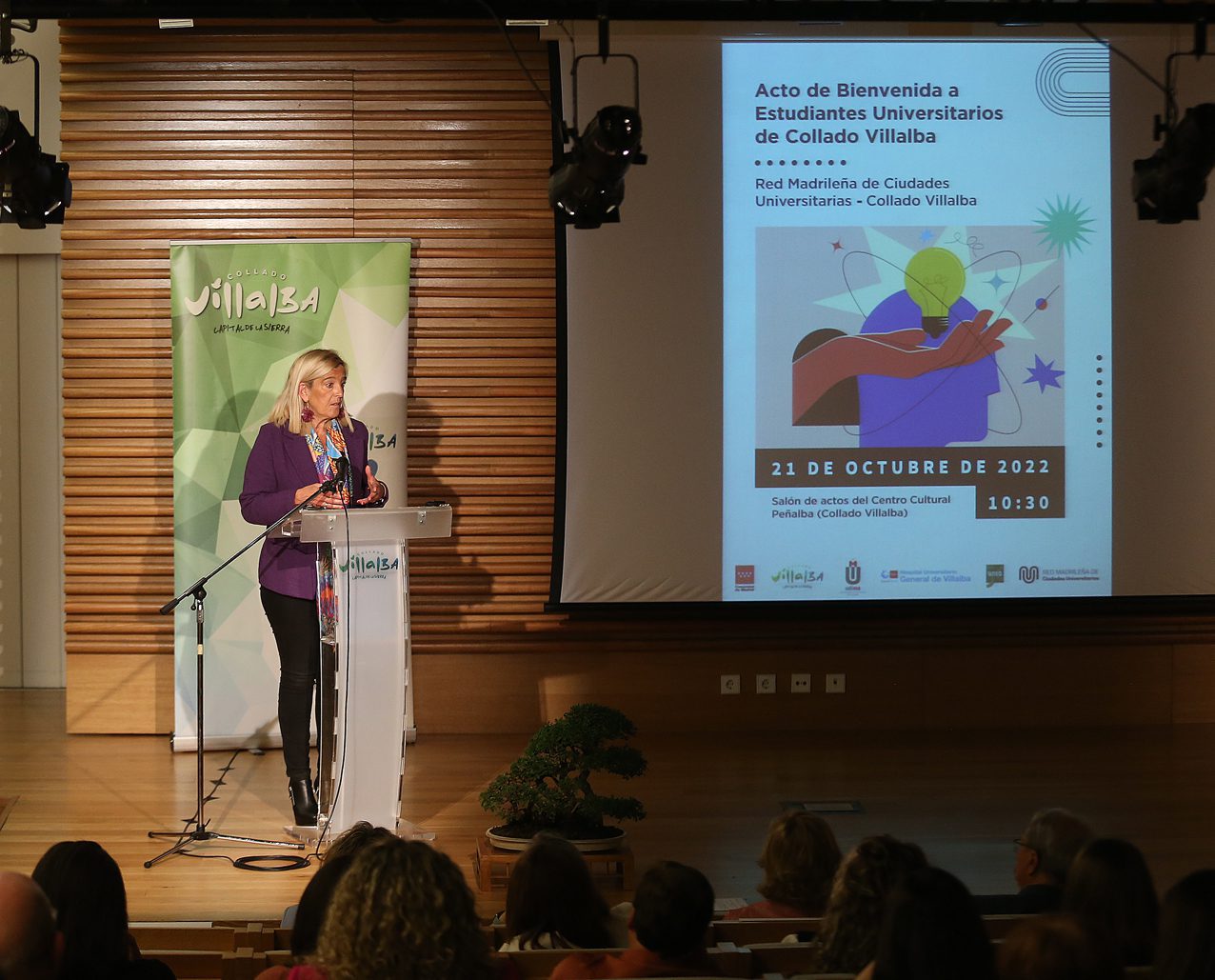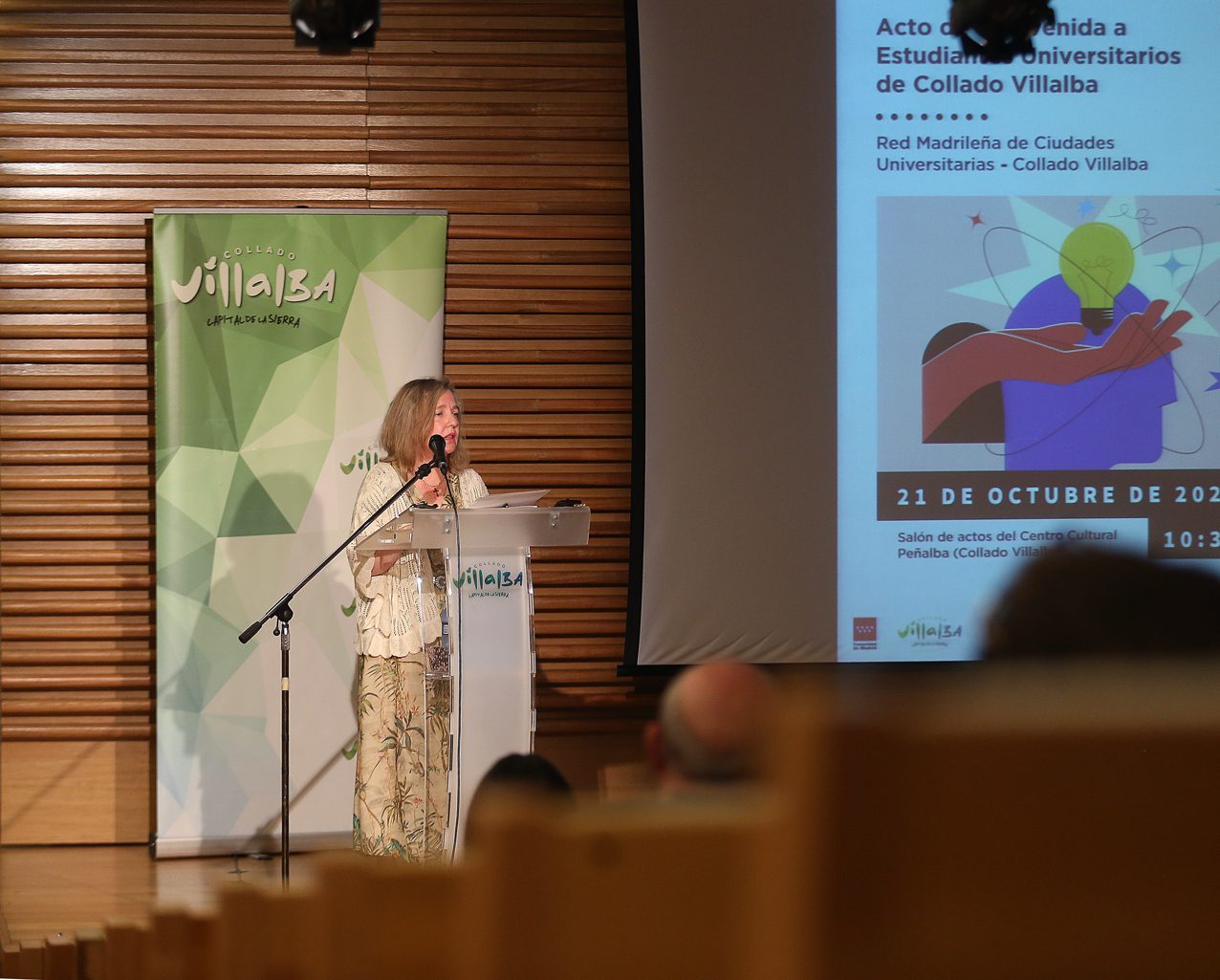 La alcaldesa de Collado Villalba, Mariola Vargas, junto al viceconsejero de Universidades, Ciencia e Innovación de la Comunidad de Madrid, Fidel Rodríguez Batalla, y la concejala de Educación, Yolanda Martínez, han presidido esta mañana en el Centro Cultural Peñalba el acto institucional de bienvenida a los estudiantes universitarios de la localidad. Un encuentro que se enmarca dentro de la reciente adhesión del municipio a la Red Madrileña de Ciudades Universitarias de la Comunidad de Madrid.