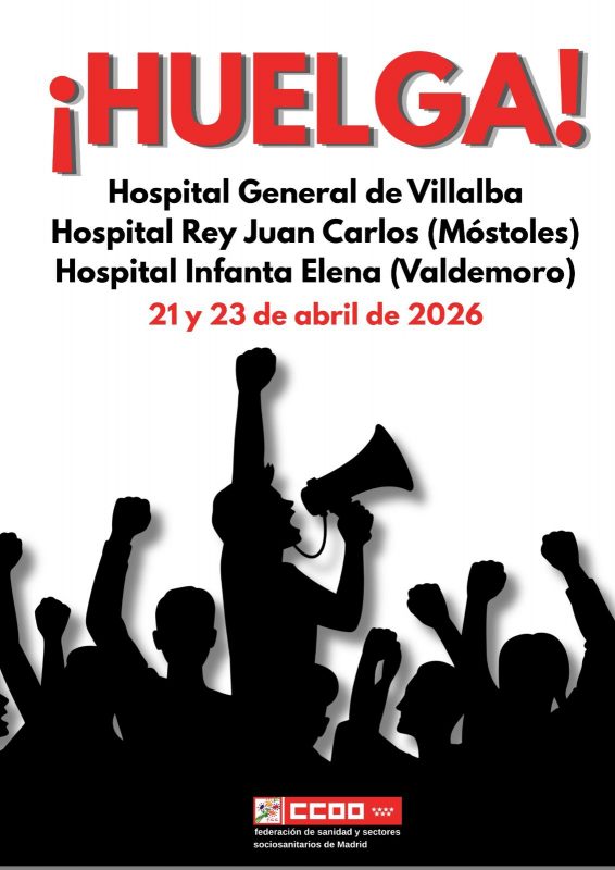 La Federación de sanidad y sectores sociosanitarios del sindicato Comisiones Obreras de Madrid (FSS-CCOO de Madrid) ha convocado huelga los días 21 y 23 de abril en los hospitales concesionados de la Comunidad de Madrid gestionados por el grupo Quirón —el Hospital General de Villalba, el Hospital Universitario Rey Juan Carlos de Móstoles y el Hospital Universitario Infanta Elena de Valdemoro— y denuncia la falta de avances en la negociación de mejoras laborales para sus plantillas.