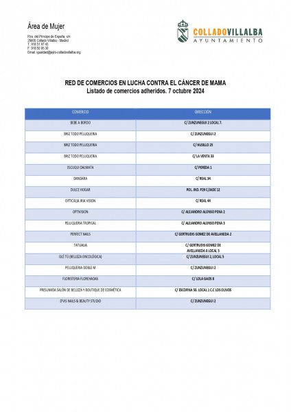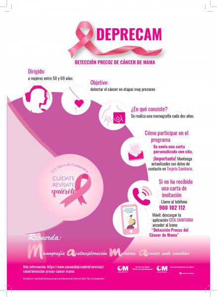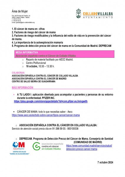 Asimismo, el área de Mujer, en colaboración con la Asociación contra el cáncer de Collado Villalba, instalará una Mesa Informativa, en el Centro Polifuncional, el viernes 18 de octubre, de 10:30 h. a 13:30 h., con el objetivo de concienciar sobre la importancia de la prevención en la lucha contra esta enfermedad.