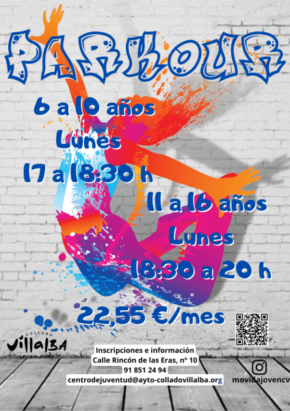 El Taller de Parkour se imparte los lunes a las 17:00 h. para niños y niñas de 6 a 10 años, y a las 18:30 horas para adolescentes de 11 a 16 años. Este taller fomenta el ejercicio físico de forma segura y creativa, mejorando la coordinación, el equilibrio y la agilidad, al tiempo que refuerza la autoestima, la confianza personal y valores como el esfuerzo, la superación y el compañerismo.