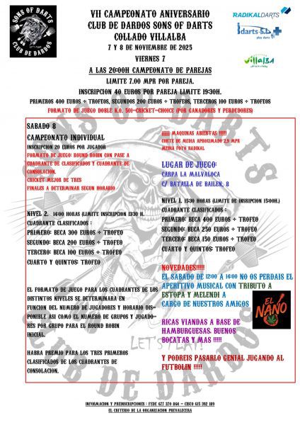 Los próximos 7 y 8 de noviembre la Carpa Malvaloca de Collado Villalba será el escenario del VII Campeonato del Club de Dardos, que incluirá torneos individuales y por parejas y actuaciones musicales. Se trata de una competición de dardos, en sus distintas variantes y para todas las edades, con la colaboración del Área de Participación Ciudadana del Ayuntamiento, y organizada por la asociación local sin ánimo de lucro “Sons of Darts”, entidad que viene realizando distintas ligas de dardos, campeonatos, entrenamientos, cursos de formación y realización de eventos y competiciones nacionales e internacionales.