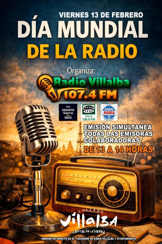 El Ayuntamiento de Collado Villalba, con motivo de la celebración del Día Mundial de la Radio, mañana, viernes 13 de febrero, ha organizado un programa especial, que será transmitido simultáneamente por cuatro emisoras locales: Radio Villalba, Onda Cero, Cadena Ser y Radio Marca. El objetivo de esta iniciativa es rendir un merecido homenaje a un medio que forma parte esencial de la vida cotidiana de los vecinos: la radio local. La emisión especial en directo tendrá lugar entre las 13:00 h. y las 14:00 h., desde el Centro Cultural Peñalba, y estará abierta a la participación de las emisoras locales de la localidad y de cualquier vecino que desee asistir como público, hasta completar aforo.