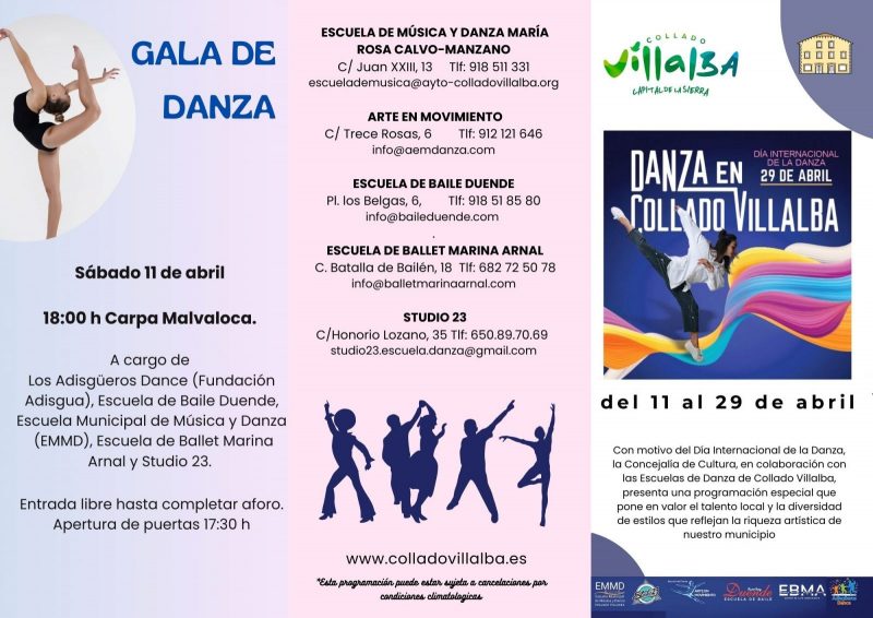 El lunes 29 de abril se celebra el Día Internacional de la Danza y la Concejalía de Cultura de Collado Villalba junto con las distintas escuelas de danza del municipio conmemorarán esta fecha con exhibiciones al aire libre, clases magistrales y espectáculos, que se sucederán del 11 al 29 de abril en diferentes espacios de la localidad.