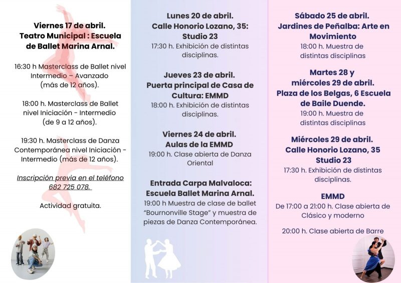 - Tres masterclass gratuitas de ballet y danza contemporánea. Teatro Municipal de Casa de Cultura, a partir de las 16:30 h. Las plazas son limitadas por lo que es necesario inscripción previa en 682 725 078 o Escuela de Ballet Marina Arnal.