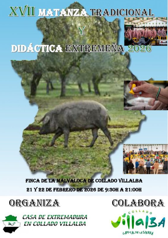 La Casa de Extremadura, en colaboración con el Ayuntamiento de Collado Villalba, celebra este fin de semana, 21 y 22 de febrero, la «XVII Matanza Didáctica Extremeña», en la Carpa de La Malvaloca. Una actividad abierta al público, que permitirá degustar las viandas típicas de esta vieja tradición y productos de la región. Aguardiente, perrunillas, migas, rosquillas de candil, y los habituales productos del cerdo que serán saboreados en la mañana del sábado, todo acompañado con un buen vino de la tierra.