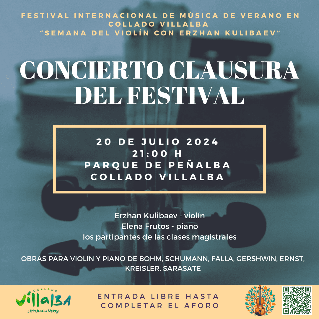 Del 15 al 21 de julio Collado Villalba acoge la Semana del Violín 2024, con una completa programación de clases magistrales y conciertos en diversos espacios de la localidad. Las clases serán impartidas por el renombrado violinista Erzhan Kulibaev.