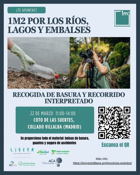 El Área de Medio Ambiente del Ayuntamiento de Collado Villalba se ha unido a la campaña “1M2 Por los Ríos, Lagos y Embalses”, promovida por el Proyecto Libera, en el que participan Ecoembes y SeoBirdlife. Así, el sábado 22 de marzo, de 11 a 14 h., se llevará a cabo una recogida de “basuraleza”, en el Coto de las Suertes y el entorno del Río Guadarrama, una actividad dirigida a todos los ciudadanos, por la que se pretende concienciar del problema del impacto de los residuos depositados en entornos naturales.