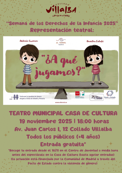 18:00 h. Obra de teatro “¿A qué jugamos?” para público infantil (+6 años), en el Teatro Casa de Cultura. El Ayuntamiento de Collado Villalba invita a las familias a asistir a esta representación teatral de la compañía El Terral Teatro, dentro de los actos de la Semana de los Derechos de la Infancia 2025. Se trata de una obra educativa y divertida que promueve el juego en igualdad, dirigida especialmente a público infantil y familiar. Las entradas pueden recogerse a partir del 10 de noviembre en el Centro de Juventud o media hora antes del espectáculo en la Casa de Cultura (hasta completar aforo).