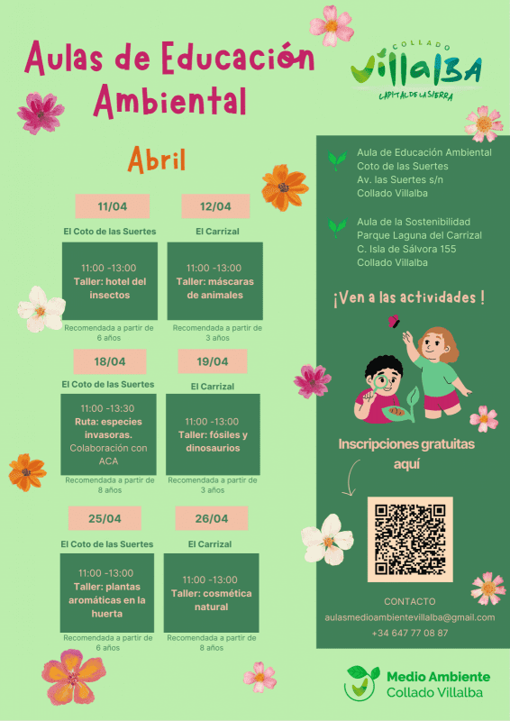 Todas las actividades y talleres son completamente gratuitos, previa inscripción (https://www.colladovillalba.es/-/diversos-talleres-y-una-ruta-por-el-coto-de-las-suertes-entre-las-actividades-del-mes-de-abril-en-las-aulas-de-naturaleza).