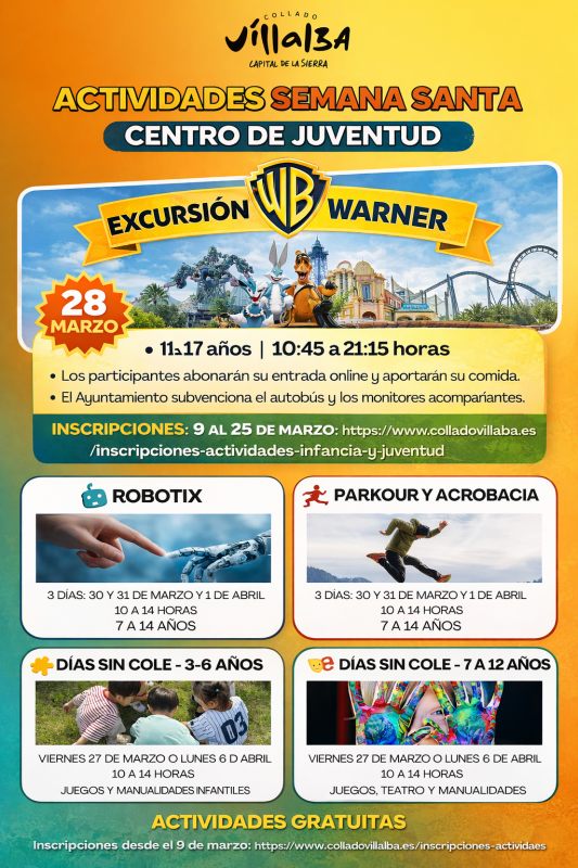 Además, el programa incluye una excursión para jóvenes con destino al Parque Warner Madrid (el sábado 28 de marzo). Una jornada completa de convivencia y diversión en uno de los parques temáticos más reconocidos, con acompañamiento educativo.