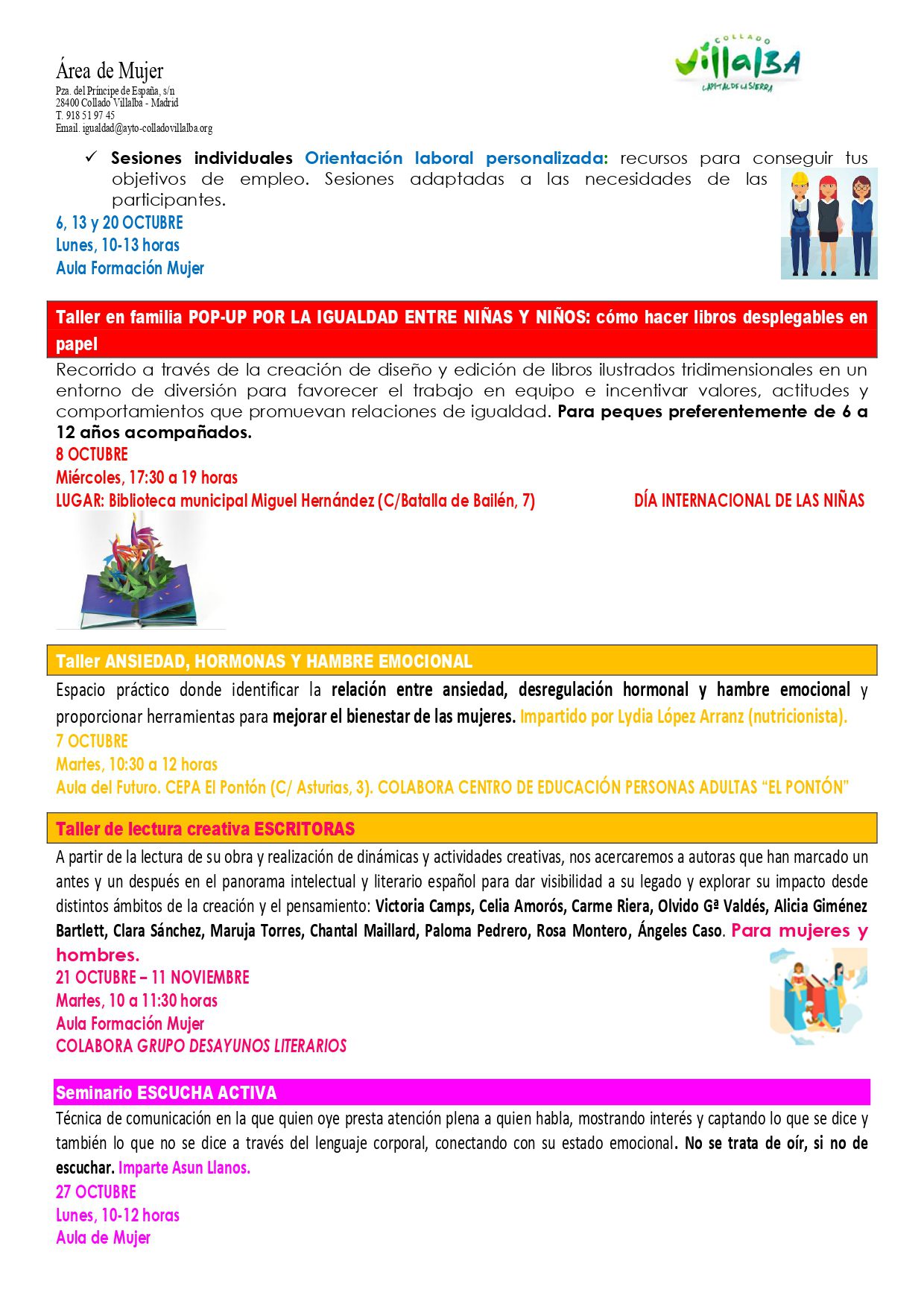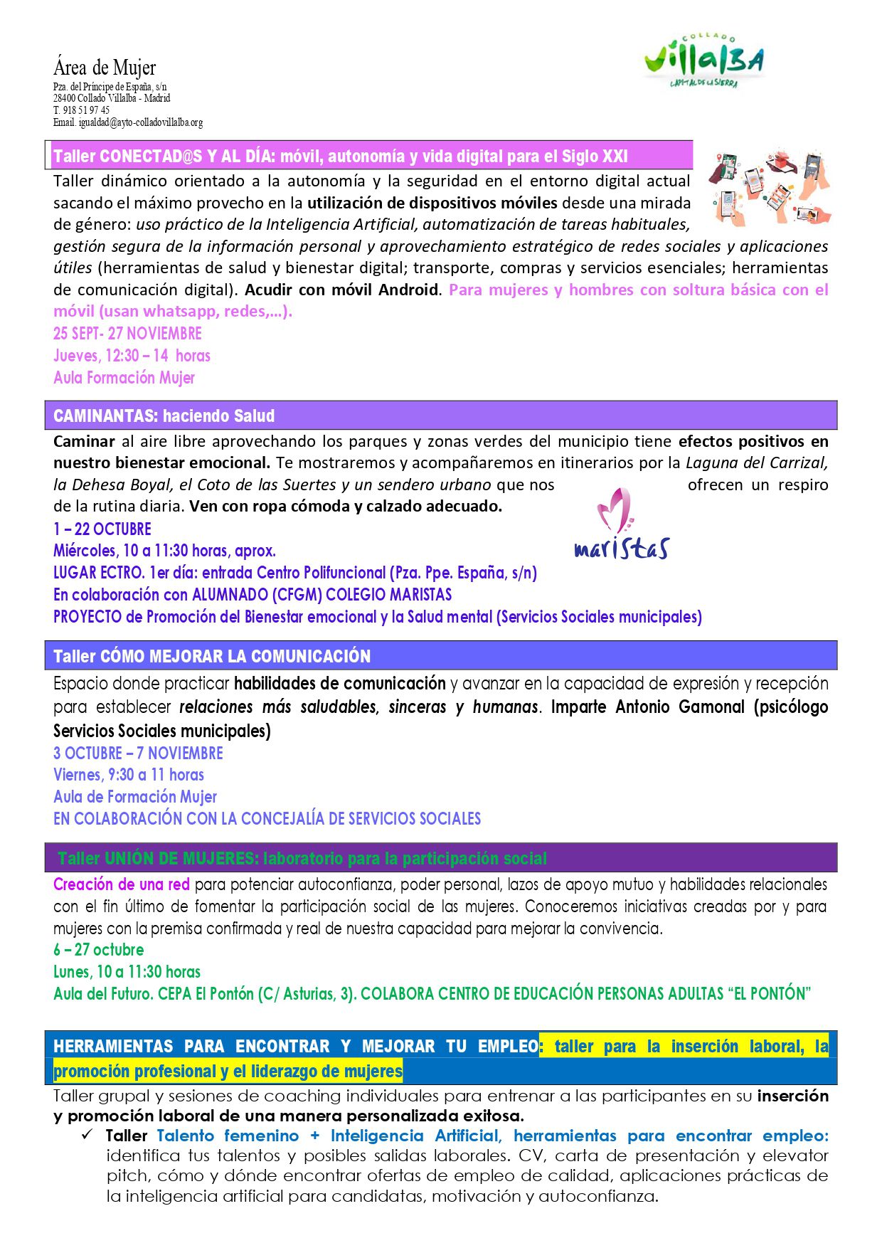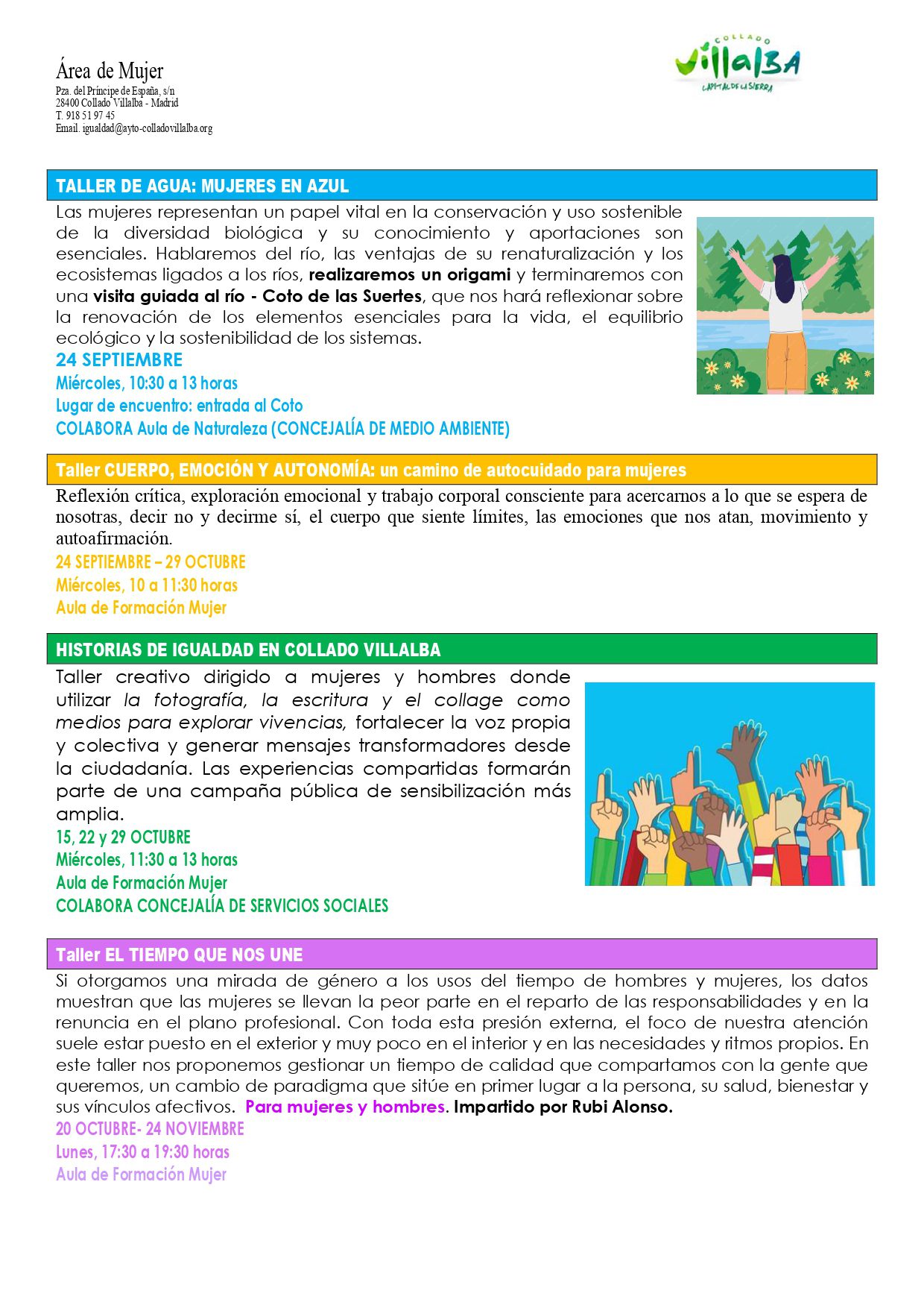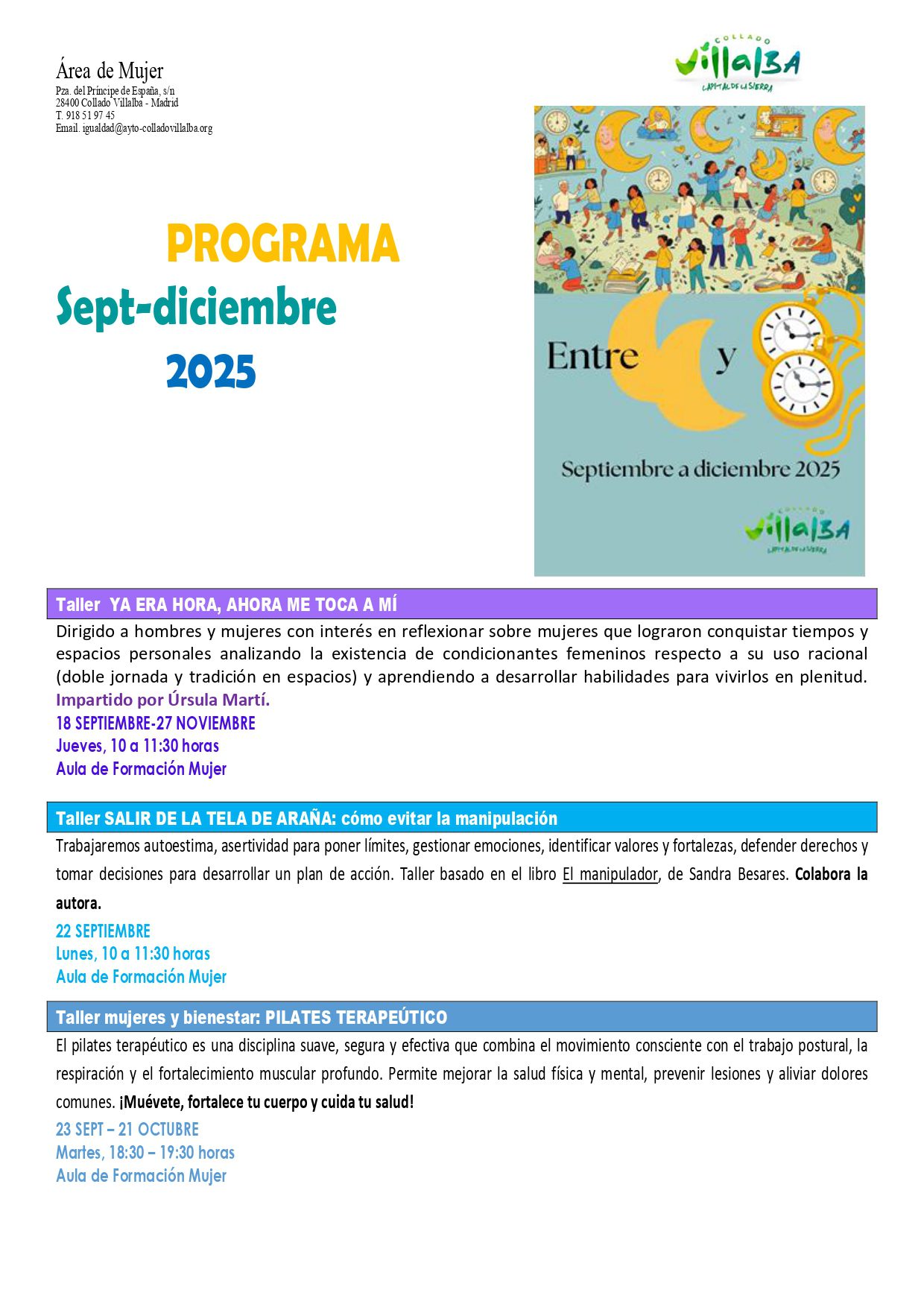 El Área de Mujer del Ayuntamiento de Collado Villalba ha presentado su programación para este último cuatrimestre del año, un variado y amplio abanico con más de 20 actividades y talleres diferentes y más de 500 plazas disponibles, con inscripción gratuita. Bajo el título “Entre lunas y relojes”, hoy, viernes 12 de septiembre, se abre el periodo de inscripción de una oferta formativa que la Concejalía de Mujer pone a disposición de la población del municipio bajo la premisa de crear espacios y tiempos compartidos por igual entre mujeres y hombres.