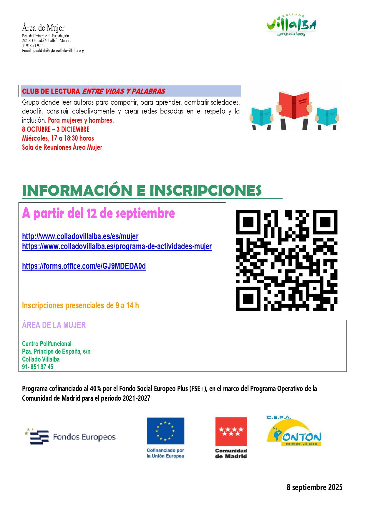 Inscripciones: online a través de la web municipal (https://www.colladovillalba.es/es/programa-de-actividades-mujer) o en la propia Concejalía para aquellas personas con dificultad en el acceso a medios tecnológicos.