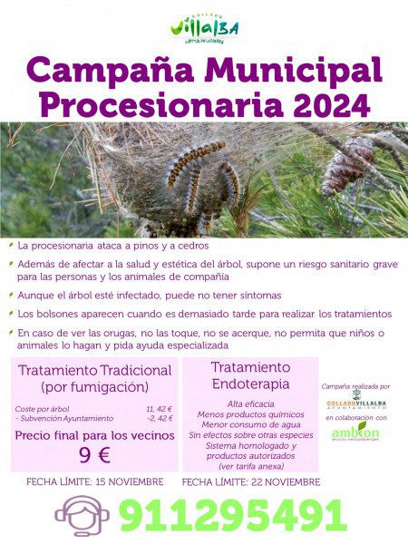 El Ayuntamiento de Collado Villalba, desde la Concejalía de Medio Ambiente, pone en marcha una nueva edición de la tradicional Campaña contra la Procesionaria, un insecto que ataca a pinos y cedros y que puede generar afecciones alérgicas a la población. Además de afectar a la salud y estética del árbol, la procesionaria supone un riesgo sanitario grave para las personas y los animales de compañía.