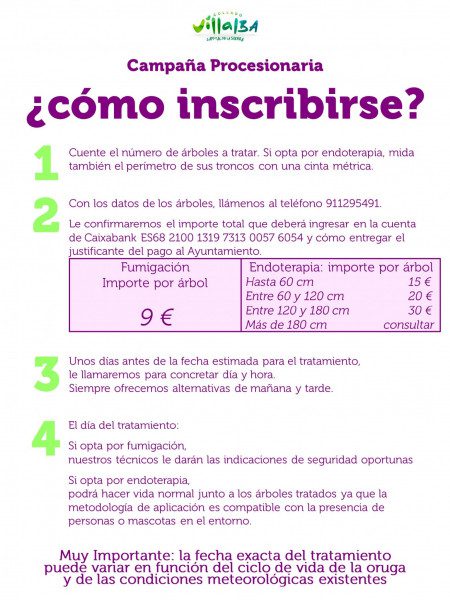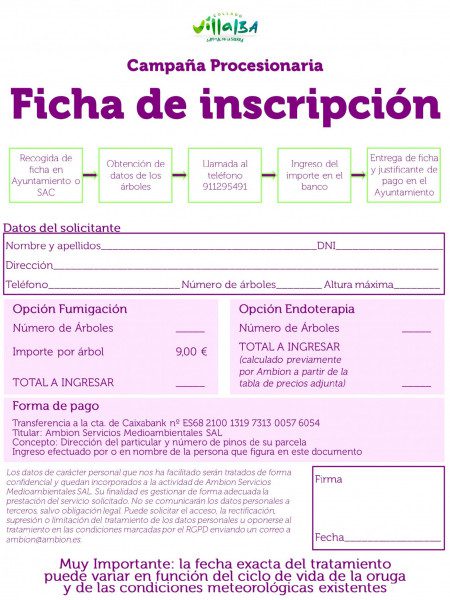 Desde la Concejalía de Medio Ambiente se pide la colaboración de todos aquellos propietarios de fincas con pinos o cedros, que recibirán una ayuda municipal de 2,42 euros por árbol, de forma que el precio final para los vecinos será de 9 euros por cada árbol fumigado.