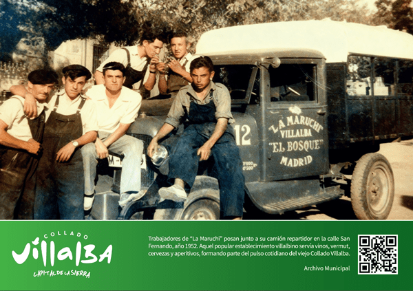 - Abril. Trabajadores de “La Maruchi” posan junto a su camión repartidor en la calle San Fernando, año 1952. Aquel popular establecimiento villalbino servía vinos, vermut, cervezas y aperitivos, formando parte del pulso cotidiano del viejo Collado Villalba. (Archivo Municipal).