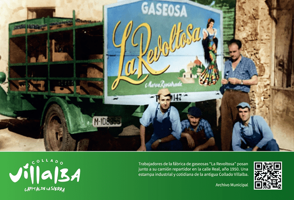 - Marzo. Trabajadores de la fábrica de gaseosas “La Revoltosa” posan junto a su camión repartidor en la calle Real, año 1950. Una estampa industrial y cotidiana de la antigua Collado Villalba. (Archivo Municipal).