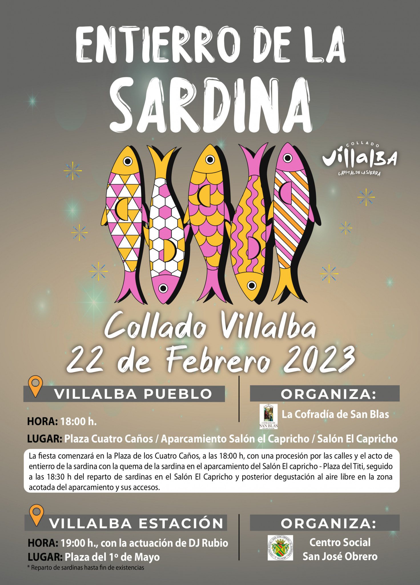 Este miércoles, 22 de febrero, la Cofradía de San Blas y la Peña San José Obrero, en colaboración con el Ayuntamiento de Collado Villalba, celebran el tradicional Entierro de la Sardina. En Villalba Pueblo la fiesta comenzará en la Plaza de los Cuatro Caños, a las 18:00 h, con una procesión por las calles del casco antiguo y el posterior acto de entierro de la sardina, en el aparcamiento del Salón El capricho y Plaza de El Titi.