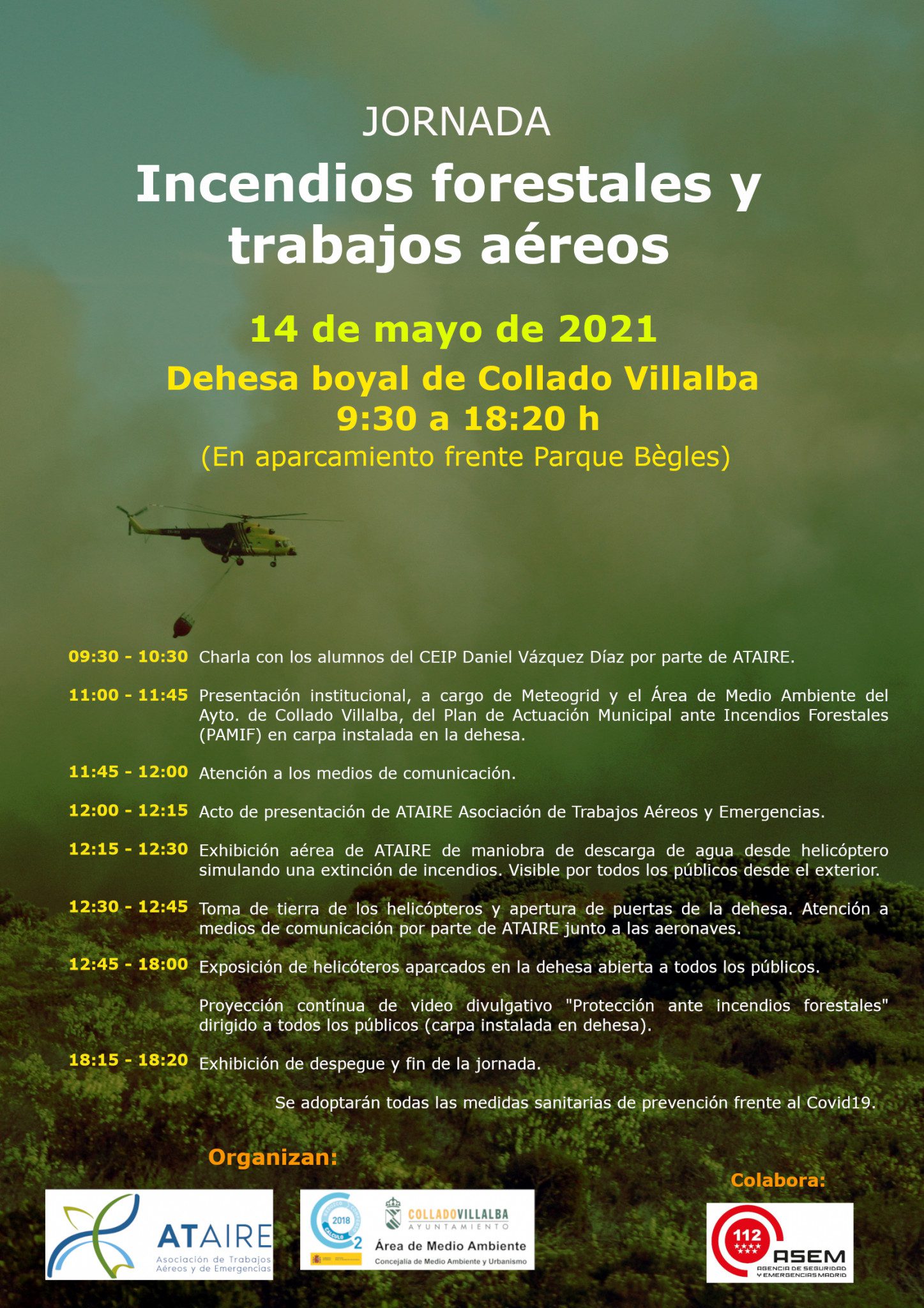 Este viernes, 14 de mayo, Collado Villalba será el epicentro de una jornada de información, educación y concienciación sobre los incendios forestales organizada por el Ayuntamiento y ATAIRE, la Asociación de Trabajos Aéreos y de Emergencias. A lo largo de todo el día se llevarán a cabo distintas actividades focalizadas en la presentación del Plan de Actuación Municipal ante Incendios Forestales (PAMIF) y la presentación pública de ATAIRE, la asociación de carácter nacional dedicada a los trabajos aéreos y las emergencias, entre las que están la extinción de incendios forestales, los rescates en alta mar y montaña o las emergencias sanitarias. Esta asociación aglutina a más del 80 por ciento de las empresas dedicadas a esta actividad.