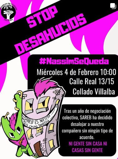 Los próximos miércoles 4 y jueves 5 de febrero, a las 10.00 horas, está previsto que se produzcan desahucios en cuatro viviendas ocupadas de la calle Real 13-15 de Collado Villalba. La respuesta de la Asamblea de Vivienda del municipio es la convocatoria de dos concentraciones de protesta – el día 4 a favor de Nassim y el día 5 para apoyar a Gustavo- frente a este bloque tras denunciar que esta orden se produce «en plena negociación por un alquiler social».