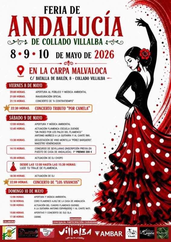 Desde el viernes 8 al domingo 10 de mayo, la Carpa Malvaloca acoge la Feria de Andalucía 2026, organizada por el Ayuntamiento en colaboración con la Casa Regional de Andalucía de Collado Villalba, la Escuela de Baile Duende y el patrocinio de Cervezas AMBAR, con variadas actuaciones, coros y demostraciones de la cultura andaluza, con acceso gratuito y aforo limitado; un encuentro abierto al público donde se combina la música, el baile y la gastronomía.
