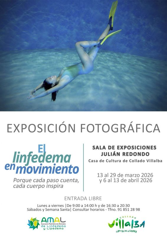 La muestra fotográfica «El linfedema en movimiento”, organizada por la Asociación Madrileña de Afectados de Linfedema y Lipedema (AMAL), en colaboración con la Concejalía de Cultura del Ayuntamiento de Collado Villalba, permanecerá en Sala de Exposiciones Julián Redondo de la Casa de Cultura del 13 de marzo al 13 de abril, en horario de lunes a viernes de 9:00 a 14:00 y de 16:30 a 20:30 horas. Una propuesta que busca visibilizar esta enfermedad y mostrar la fortaleza de quienes conviven con ella.