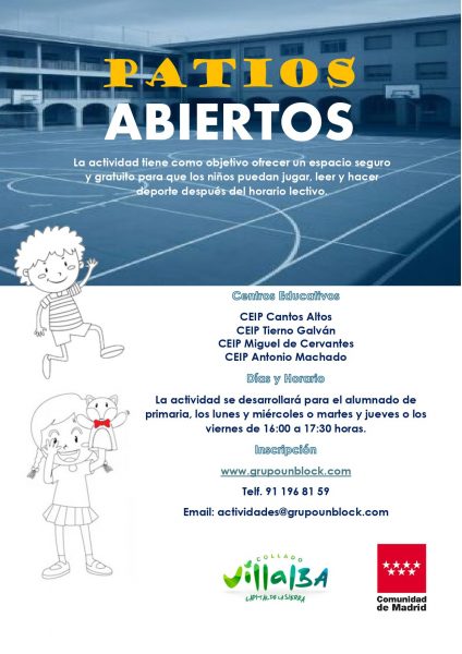 El Ayuntamiento de Collado Villalba, desde la Concejalía de Educación y en colaboración con la Comunidad de Madrid, pone en marcha el programa ‘Patios Abiertos’, una iniciativa destinada a promover la convivencia, el deporte y el aprovechamiento de los espacios escolares fuera del horario lectivo. A partir del próximo 1 de octubre, los patios de los colegios Cantos Altos, Tierno Galván, Miguel de Cervantes y Antonio Machado permanecerán abiertos de lunes a viernes, entre las 16:00 y las 17:30 horas. Durante este tiempo, los centros escolares se transformarán en un punto de encuentro seguro y gratuito para el juego, la lectura y la práctica deportiva, contribuyendo al fortalecimiento de la vida comunitaria y a la conciliación familiar.