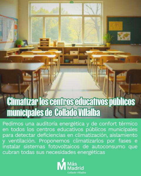 Desde Mas Madrid Collado Villalba se señala que «para abordar la climatización de los centros educativos necesario elaborar un plan de inversión a medio plazo para adaptar los centros educativos por fases, como se propuso en la moción que presentaron a Pleno en enero de 2022 sobre autoconsumo eléctrico con placas solares en centros municipales de Infantil y Primaria financiando parte de la inversión mediante los ahorros energéticos logrados».