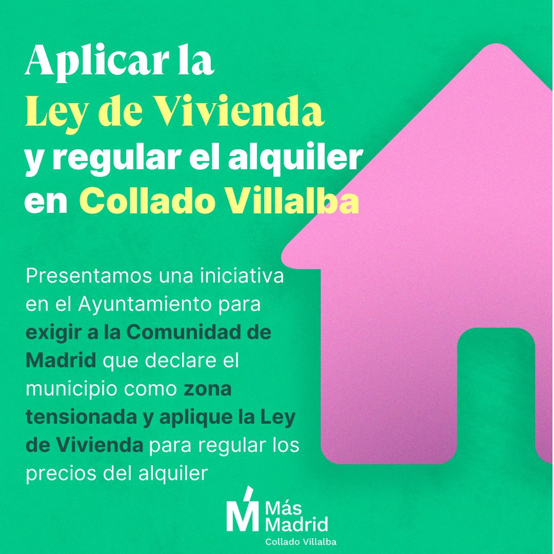 El grupo municipal de Más Madrid Collado Villalba ha registrado una moción para instar a la Comunidad de Madrid a que aplique la ley de vivienda estatal y permita que Collado Villalba sea declarado como zona tensionada, con el objetivo de que se apliquen las medidas recogidas en dicha ley, como la regulación del precio de los alquileres, o considerar como “gran tenedor” a los propietarios con más de cinco inmuebles, entre otras medidas.