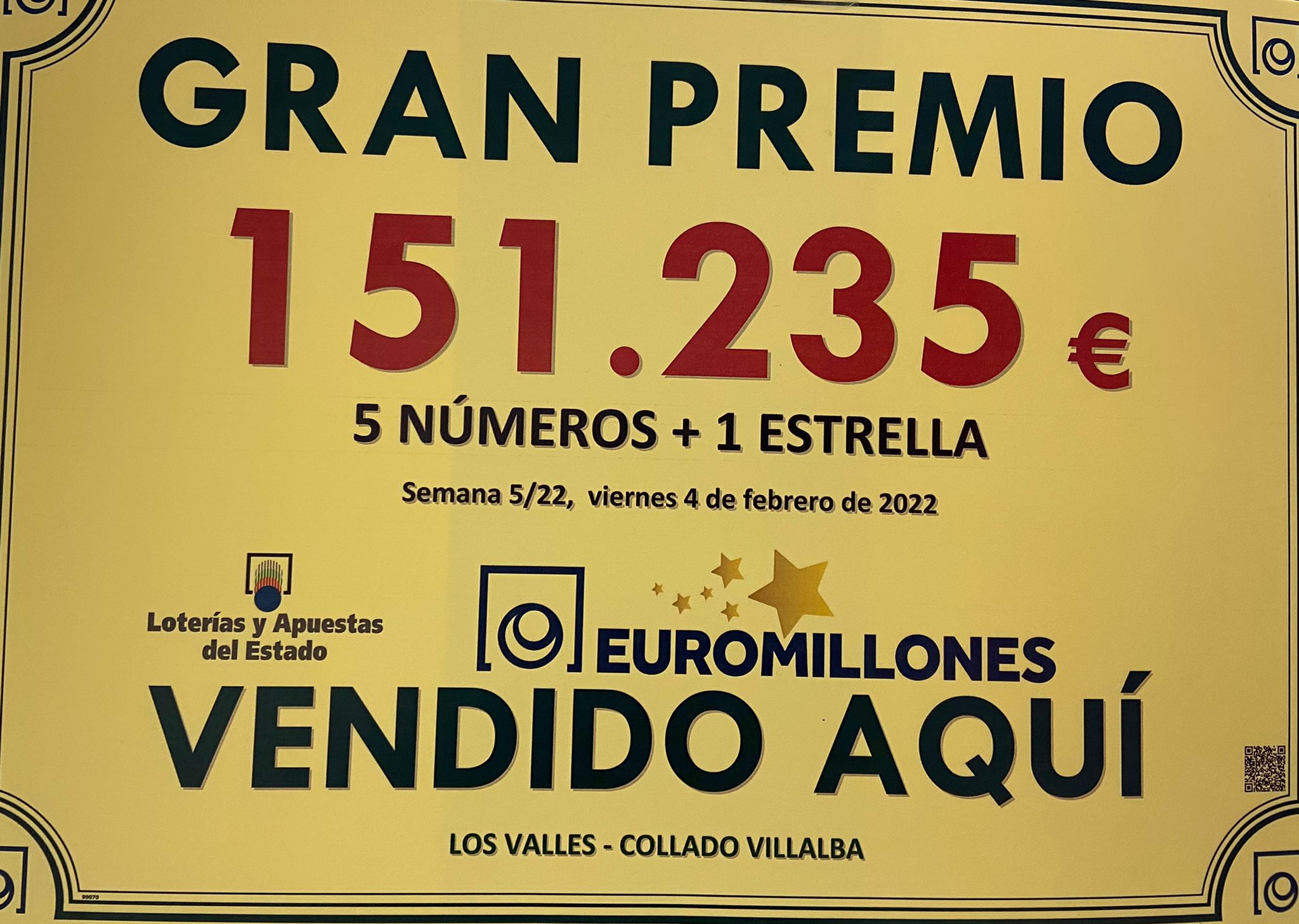 En esta ocasión, el boleto ganador fue validado en el Reino Unido, sin embargo en Collado Villalba, hay un acertante de Segunda Categoría, con cinco números y una estrella, que validó su boleto a través de la página web (www.administracion3villalba.com) en la Administración de Loterías de Los Valles. Por ello, esta persona recibirá 151.235 euros.