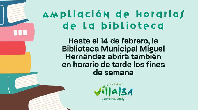 Collado Villalba prorroga la ampliación de horarios de la biblioteca Miguel Hernández los fines de semana hasta el 14 de febrero