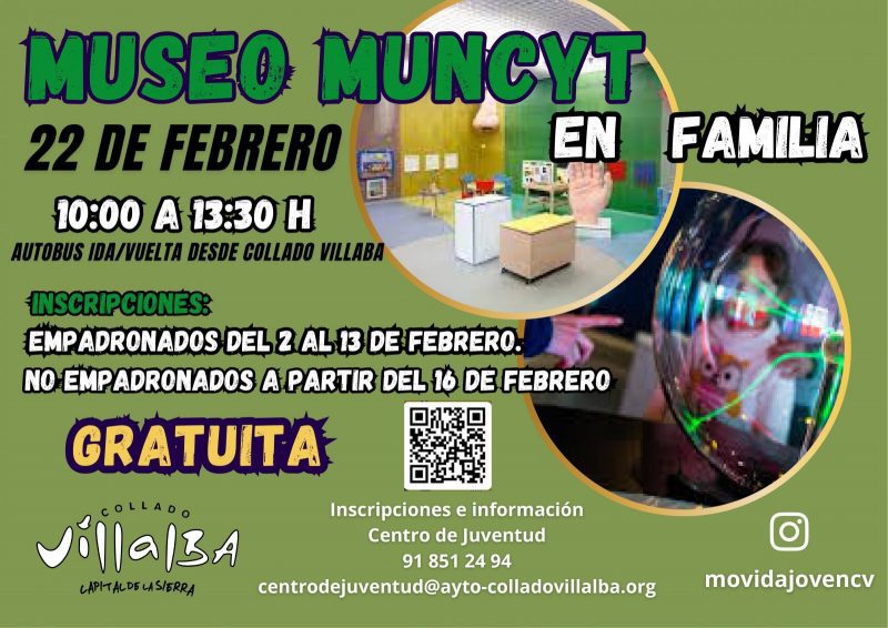 Hoy, lunes 2 de febrero, se abre el plazo de inscripción en la visita a MUNCYT, el Museo Nacional de Ciencia y Tecnología, en Alcobendas, que se celebrará el día 22 de febrero, de 10:00 a 13:30 h. Se trata de una nueva edición del Programa de Excursiones en Familia, que tiene como fin el desarrollo de actividades culturales y de ocio en el ámbito familiar y que organiza el área de Infancia y Juventud de Collado Villalba.