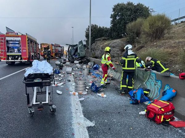 El siniestro se ha producido por un alcance entre un autobús, en el que viajaban 32 pasajeros, todos ellos adultos, y un vehículo de reparto. La carga del camión de Mahou ha quedado esparcida en la carretera provocando el corte de tres carriles, lo que ha obligado a cortar tanto el carril derecho como el central de la vía.