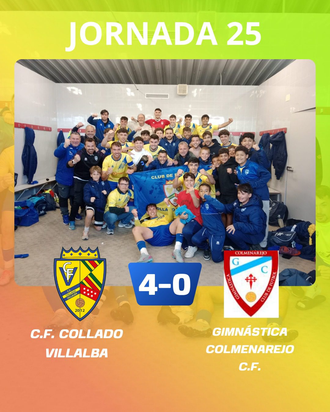 Una vez logrado el gran objetivo del ascenso, el CF Collado Villalba buscará el título de Liga, en la cerrada lucha que mantiene con el Athletic Club de Colmenarejo. El equipo que dirige Miguel Ángel Zapatero goleó en esta jornada por 6-0 al Becerril y se mantiene a cuatro puntos, con el golaverage particular favorable a los colmenarejanos.
