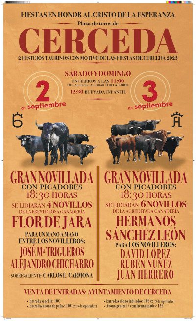 Desde el jueves 31 de agosto hasta el lunes 4 de septiembre, Cerceda celebrará sus fiestas de verano, con un programa de actividades taurinas que serán las protagonistas del fin de semana: con encierro para adultos, bueyada para los más pequeños y, las tardes del sábado y domingo a las 18:30, novilladas con picadores.