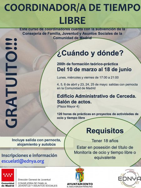 El Ayuntamiento de El Boalo, Cerceda y Mataelpino oferta un curso coordinador de tiempo libre que se desarrollará del 10 de marzo al 18 de junio a lo largo de 200 horas (120 de ellas de prácticas) en proyectos de actividades de ocio y tiempo libre. Además habrá salidas con pernocta en la Comunidad de Madrid.