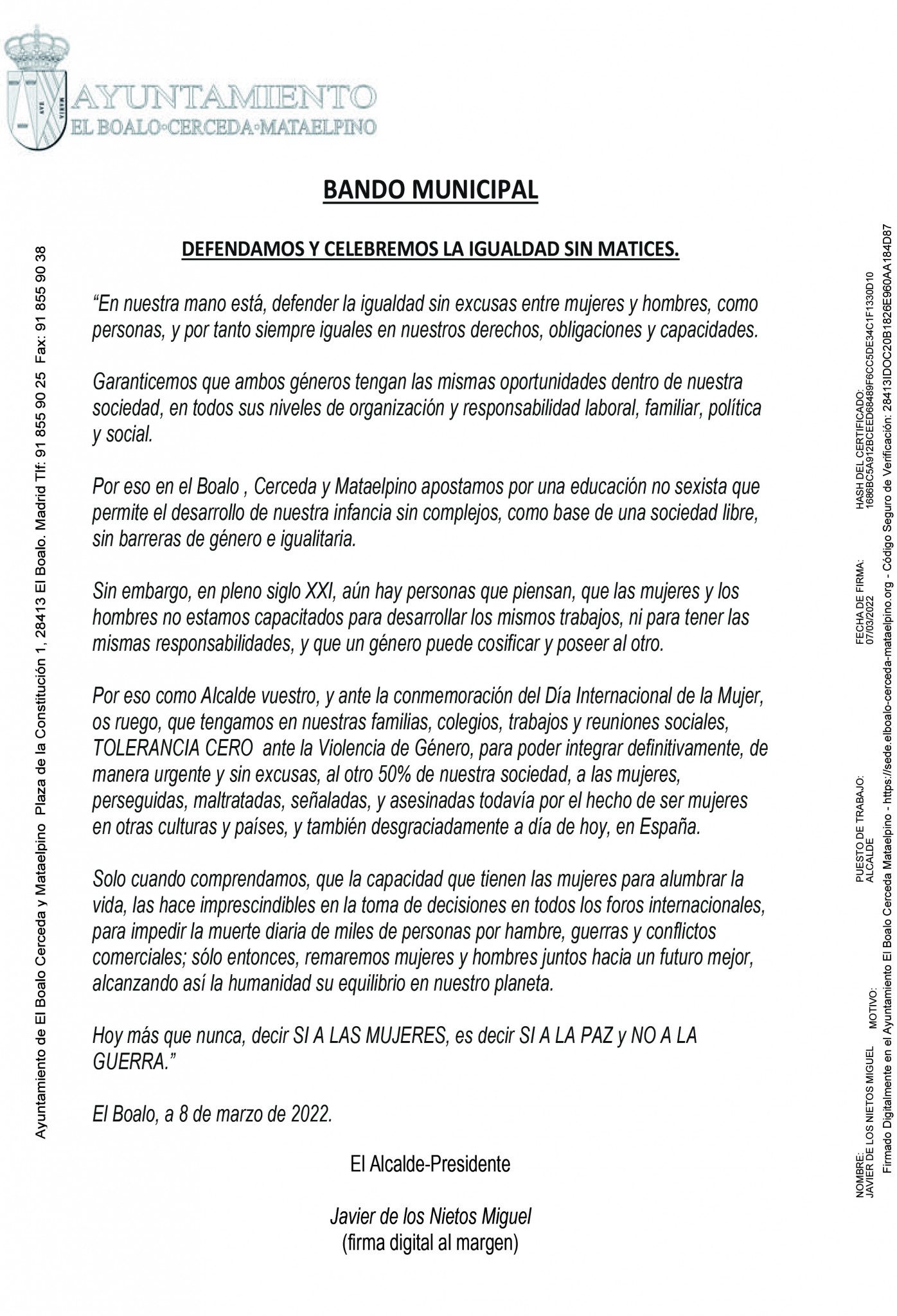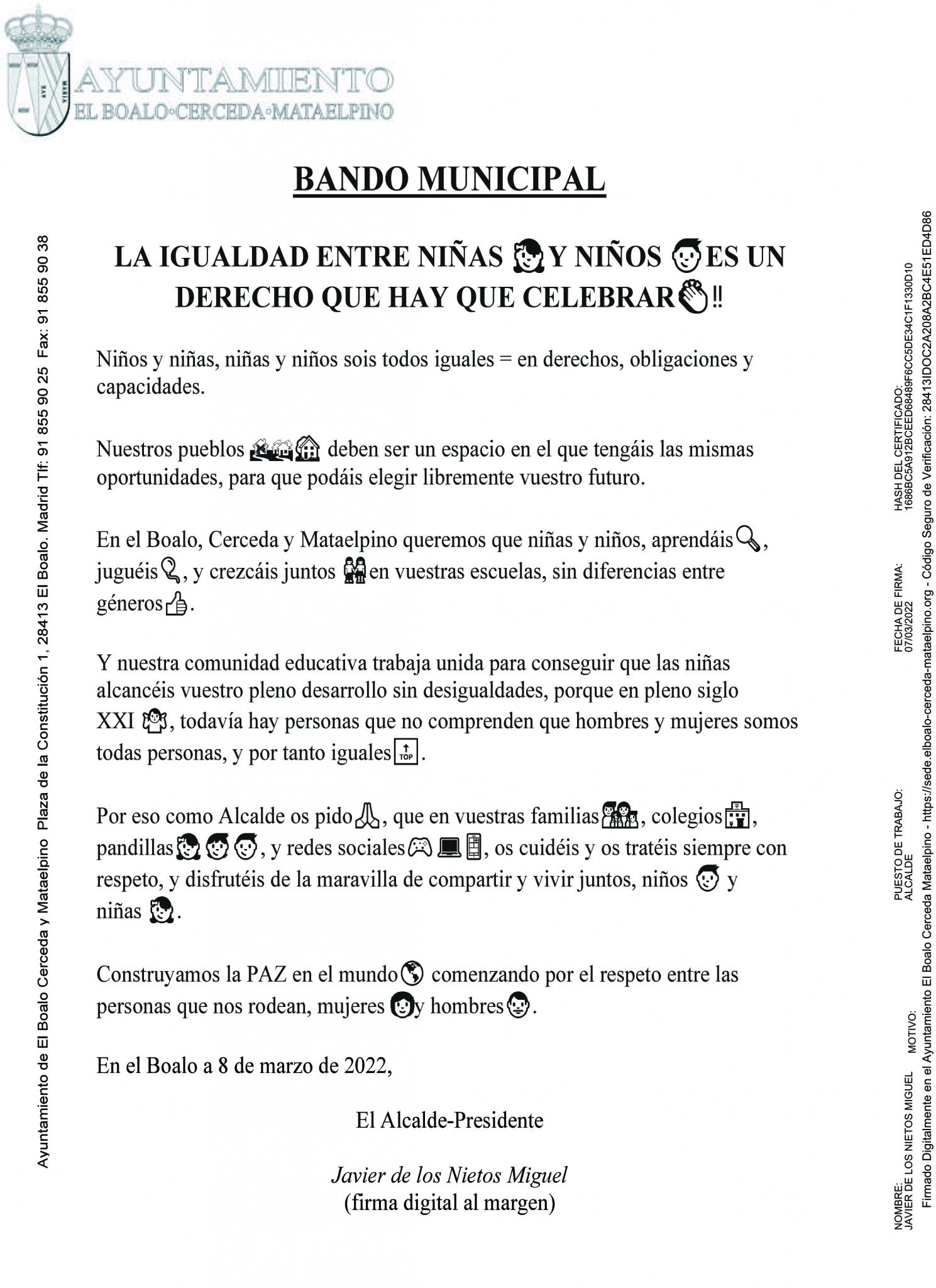 El alcalde de El Boalo, Cerceda y Mataelpino, Javier de los Nietos, ha publicado dos bandos, uno dirigido a la población adulta y otro a los niños del municipio dentro dentro la campaña «12 bandos por 12 causas», sobre la celebración del 8 de Marzo.