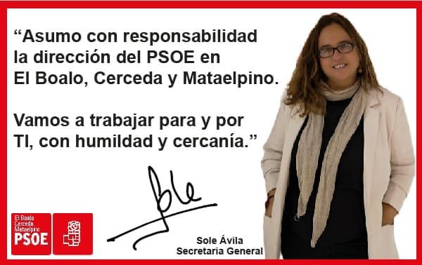 La militancia del PSOE de El Boalo, Cerceda y Mataelpino ha elegido a Soledad Ávila Ribada como su secretaria general en las elecciones primarias celebradas hoy. Con una participación del 100 por cien del censo de personas afiliadas, “Sole”, como la conocen en la comarca de la Sierra del Guadarrama, ha obtenido el 100 por cien de los votos; siendo la única candidatura presentada.